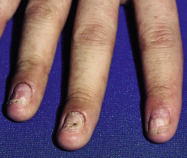 Cutaneous involvement most often appears initially on the face and upper trunk. Palms and soles are commonly involved ( Figs. 20-20 and 20-21 ). Erythematous and purpuric macules may develop flaccid gray discoloration or bullae ( Figs. 20-22 and 20-23 ), become confluent, and sometimes detach, leaving a raw, denuded base ( Figs. 20-24 and 20-25 ). Some of the macular lesions may show a dusky center, which gives a target-like (targetoid) appearance; however, the characteristic concentric rings of EM are absent. Some patients show limited targetoid lesions and little detachment (more typical of SJS), and others show extensive detachment (more typical of TEN). The early morbilliform eruption of TEN may be localized but more often is an extensive, painful erythroderma. After exerting light mechanical pressure with a finger to an area of erythema, the epidermis in patients with either SJS or TEN becomes wrinkled and peels off like wet tissue paper (see Fig. 20-25 ), the characteristic Nikolsky sign. The Nikolsky sign may be seen in patients without clinical evidence of epidermal detachment and can be a useful diagnostic tool. In addition to SJS and TEN, however, the Nikolsky sign may be seen in a variety of other bullous disorders (especially pemphigus, epidermolysis bullosa [see Chapter 13 ] and the SSSS [see Chapter 14 ]). Histopathologic examination of affected skin demonstrates necrosis of the lower epidermal cells with a sparse mononuclear cell infiltrate, and in the case of TEN, extensive necrosis with a subepidermal split. The epidermal necrosis correlates with the dusky blue coloration of lesions. The nails become dystrophic because of nailbed inflammation ( Fig. 20-26 ).
