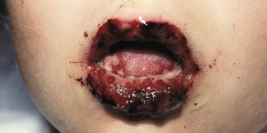 Stevens–Johnson syndrome. Mucous membrane in­­volvement with severe swelling and hemorrhagic crusting of the lips.