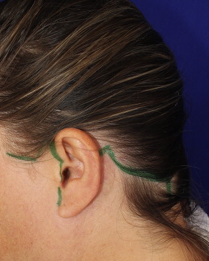 By adopting the LOPP method, surgeons abandon the submental incision, which is never necessary with the LOOP neck lift. The entire approach to the neck is done through the lateral access. Surgeons can use the incision used routinely. I usually begin an incision below the sideburn on the temporal area; then, the incision follows the border of the tragus and on the retroauricular area comes downward on the hairline for a small segment and finishes inside the hair ( Fig. 1 ). The posterior incision can be shorter in younger people, but short incisions, finishing just posteriorly above the ear lobule, as short scars style, usually are not enough to take off the large excess of skin resulting from the procedure.