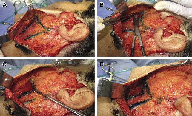With a pair of Allis forceps, the posterior edge of the incision made on the platysma is pulled back, and a small detachment on the subplatysmal tissue easily exposes the gland that sticks out ( Fig. 3 A ).