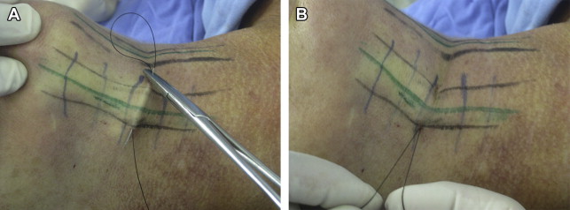 The platysmal bands are marked with patients awake and standing up and can be treated easily by two methods, the closed platysmotomy, as I describe elsewhere, using strong multibraided threads with needles ( Fig. 4 A,B ), and using the platysma incision on line A to cut the marked muscle band with a scissor, making 6 or 7 small horizontal cuts (see Fig. 4 C–E). These methods have showing effective results on my patients, without recurrence and in light cases can be used as an isolated procedure to treat primary or recurrent bands (see Fig. 4 F).