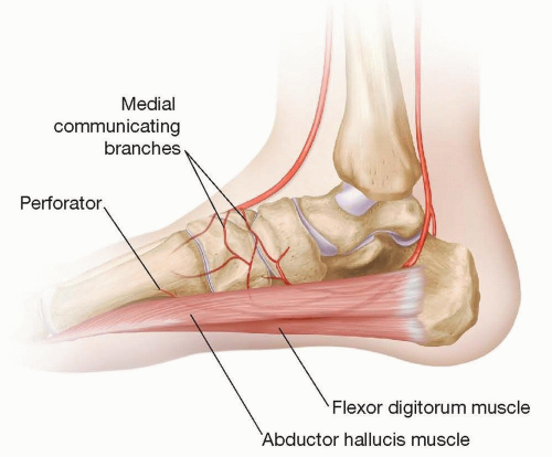 • Handheld pencil Doppler examination is typically sufficient to localize the medial plantar artery as well as intermuscular perforators emanating between the abductor hallucis medially and the flexor digitorum brevis muscle laterally.