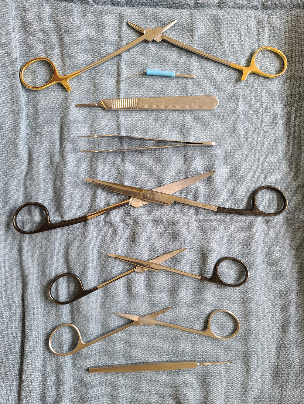 Skin closure : If there is minimal tension across the wound, running 5-0 gut or 5-0 fast absorbing gut is used to close the epidermal layer of the skin so that the sutures do not have to be removed, creating less anxiety for the patient.