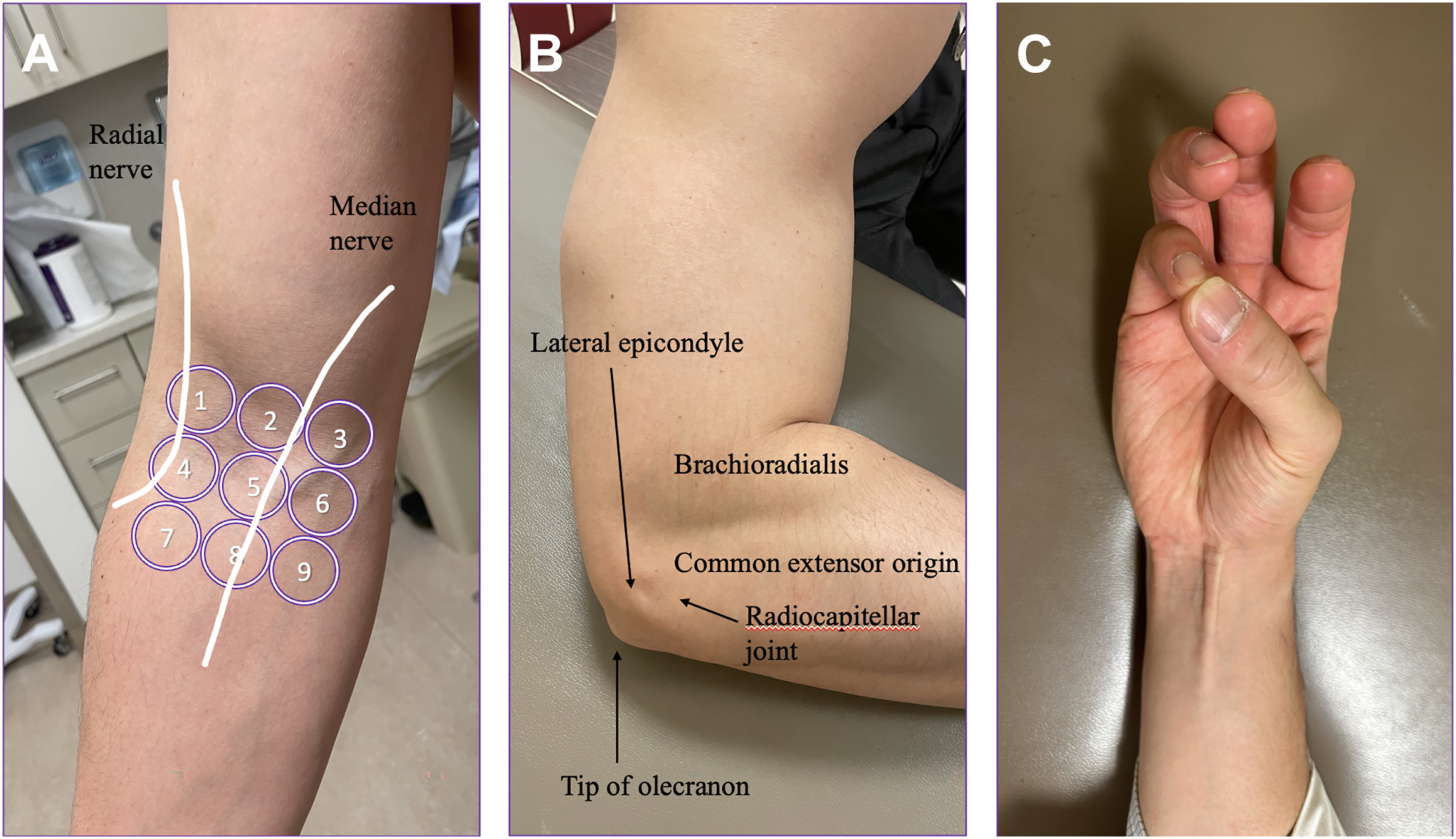 The rule-of-nine test. Palpation of 1 to 2 overlies the radial tunnel, while the course of the PIN, means palpation of circle 3 should not reproduce symptoms. Circle 4 overlies the biceps tendon, and circles 5 to 6 overlie the median nerve as it enters the PT. Palpation of the medial 3 circles (7–9) should not produce any symptoms ( A ). Superficial anatomy of the lateral elbow ( B ). The Schaeffer test with the demonstration of the presence of a palmaris longus ( C ).