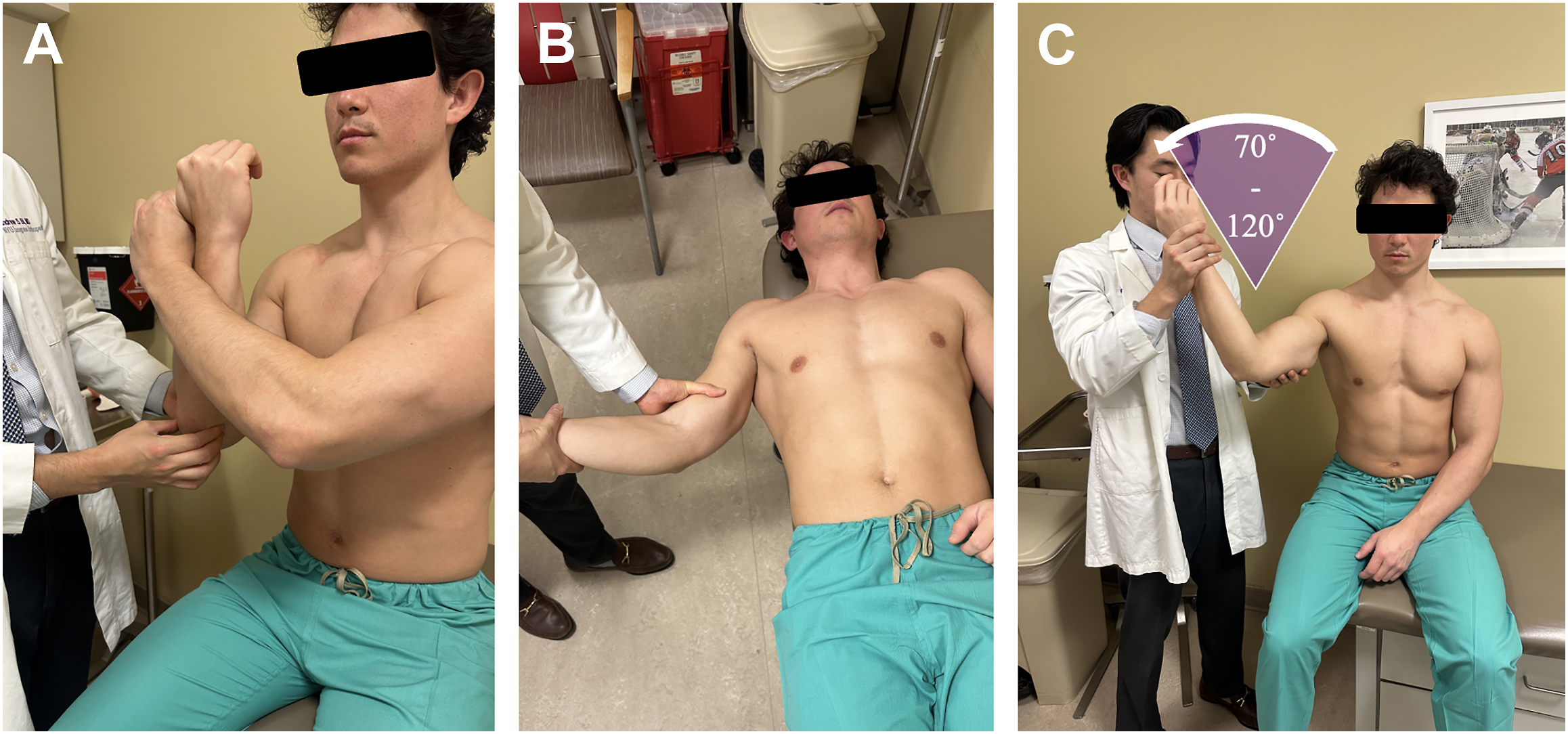Due to deficiencies in the prior examination maneuvers for detecting UCL injuries, particularly partial tears, O’Driscoll and colleagues developed the moving valgus stress test in 2005 to replicate actual stresses involved in the throwing motion. The elbow experience maximum valgus force from 120° to 90° during late cocking and early acceleration, which was the basis for the examination, in which the patient is seated or standing and the shoulder is abducted 90°. The elbow is maximally flexed, and then a valgus torque is applied to the elbow until the shoulder reaches maximal ER, then while maintaining this constant valgus torque, the elbow is quickly extended to about 30° (as expected, patients with shoulder pathology should be treated with caution with this maneuver; see Fig. 2 C). A positive test is both reproducible medial elbow pain and that the maximal pain is produced between late cocking (120° elbow flexion) and early acceleration (70° elbow flexion). This angle of maximal pain was referred to by O’Driscoll as the shear angle , and the total arc of painful motion was deemed the shear range . In the same study, they reported SN of 100% and SP of 75% compared to intraoperative assessment.