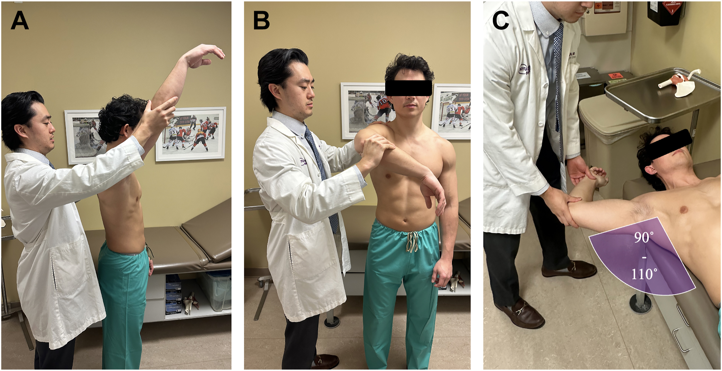 The PE of the rotator cuff has been shown to have a wide range of sensitivity (SN) and specificity (SP) for the ability to differentiate impingement, tendinosis, partial-thickness rotator cuff tears (PTRCTs), and full-thickness rotator cuff tears (FTRCTs). Impingement testing begins with Neer’s landmark publication in 1983, with descriptions as early as 1972. , The Neer Impingement Sign is elicited with the patient seated and the examiner behind, with one hand preventing scapular rotation while the other raises the patient’s arm in forced FE, causing the greater tuberosity to impinge against the acromion ( Fig. 1 A ). Neer proclaimed in this study the nonspecific nature of the testing and suggested further performance of the Neer Impingement Test , in which a 10 cc injection of 1.0% xylocaine is given in the subacromial space anteriorly, and the test is repeated, which increases the SP for external impingement. The Hawkins–Kennedy impingement test, described in 1980 as “another less reliable method of demonstrating this [external] impingement involves forward flexing the humerus to 90 degrees and forcibly internally rotating the shoulder, impaling the supraspinatus tendon against the anterior surface of the coracoacromial ligament,” and reported it more useful in the younger patient population or when considering when to resect the coracoacromial ligament ( Fig. 1 B). Hegedus and colleagues demonstrated in a meta-analysis the SN of the Neer and Hawkins–Kennedy tests to be 72% and 79%, with SP of 60% and 59%, respectively. Tests for internal impingement of the shoulder should be of particular focus in throwers given a high incidence of posterior capsular tightness, internal impingement, partial-articular rotator cuff tears, and IR deficits. These focus mostly around the Meister posterior impingement sign, described in 2004 by eliciting posterior pain , not apprehension, with bringing the shoulder into 90° to 110° abduction, slight extension, and maximum ER to impinge the posterior greater tuberosity/posterior labrum against the articular surface of the posterosuperior rotator cuff, describing an overall SN 75.5% and SP 85% ( Fig. 1 C). In vivo demonstration of internal impingement was first described by Paley and colleagues in 41 professional overhead throwing athletes, demonstrating arthroscopically contact between the rotator cuff articular surface and posterosuperior glenoid rim or greater tuberosity in 100% of subjects.
