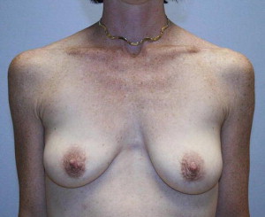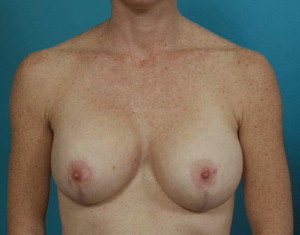 A 38-year-old patient who was 5 ft 8 in and 125 lbs underwent subpectoral augmentation with smooth-walled silicone gel devices and circumvertical mastopexy. At 1 year postoperatively, she developed a grade 3 capsular contracture of the right breast with high riding implant. At reoperation, a dense capsule was noted on the right. A total periprosthetic capsulectomy was performed; 6 × 16 cm piece of thick ADM was inset with running sutures to the anterior flap, and new implants were placed. Two years following revisionary surgery, a grade 1 capsule was present on the right (Case 1, Figs. 1–4 ). FLOAT NOT FOUND FLOAT NOT FOUND FLOAT NOT FOUND FLOAT NOT FOUND