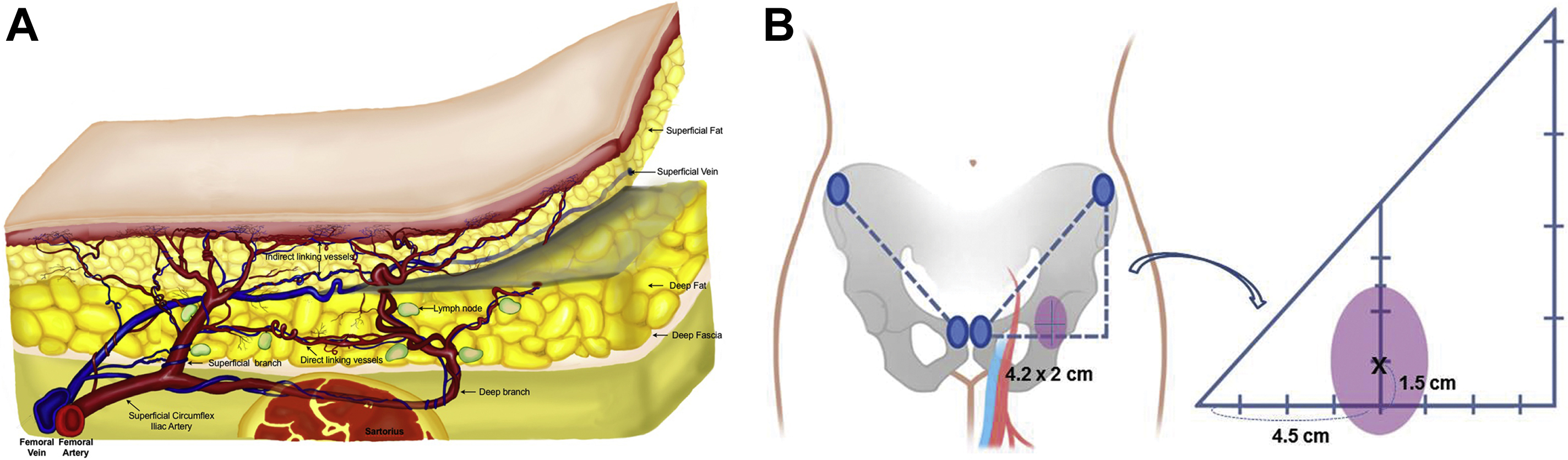 The design of the flap will vary depending on the branch used: medial branch will provide a medium or large-sized flap based on the perforator pattern (anchoring vs axial), whereas lateral branch will have an axial pattern allowing to harvest a flap extending into the flank.