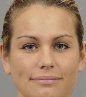 The pleasing brow in a woman is at or slightly above the orbital rim prominence and generally arches upwards as it sweeps laterally or has a break at about the two-thirds point ( Fig. 1 ). The brows should be symmetric in shape and position. There is a natural and youthful fullness to the space between the lateral brow and the upper lid. This is the same space from which women pluck brow hair, because it is attractive and youthful to have this area without hair. There are limits, however, to brow height. Generally speaking, the medial aspect of the brow should be lower than the rest of the brow and the overall brow height should not exceed far beyond the orbital rim prominence. An elevated brow position in the presence of forehead rhytids (as seen with upper lid ptosis or dermatochalsis) is not esthetic and is an indicator of old age. The esthetic brow in a man is different: it should be flat and straight and at or slightly below the orbital rim. Brow configuration other than this in a man looks odd.