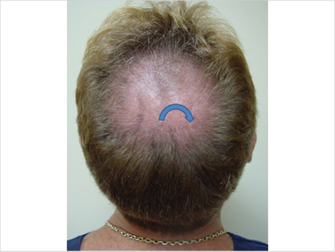 The great majority of patients present to us with at least some fine miniaturized (vellus) hairs that indicate the original pattern of hair in the vertex (Fig. 25.2). This serves as a template for recreating the vertex and especially the whorl. In patients with no vellus hairs (extremely rare), a whorl has to be designed provided there is adequate donor supply. If the supply is insufficient, it may be best to work from the periphery inward to essentially “shrink” the vertex alopecia.