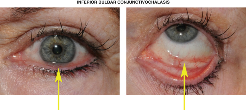 Conjunctivochalasis is characterized by redundant conjunctival tissue analogous to dermatochalasis of the eyelids. This condition is generally benign and age-dependent. Advanced conjunctivochalasis of the inferior bulbar conjunctiva can rest on the lower eyelid margin, cause ocular discomfort, tear film instability and obstruct lacrimal outflow ( Figure 52.1 , left panel). With blinking, the redundant inferior bulbar conjunctiva is continually chafed by the lower eyelid margin and becomes hyperemic ( Figure 52.1 , right panel). Conjunctivochalasis should be distinguished from chemosis, which is swelling of the conjunctiva associated with exudative fluid.