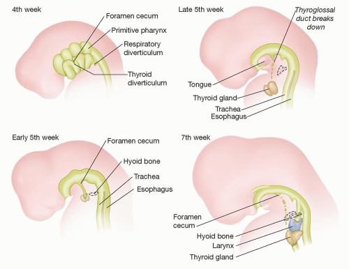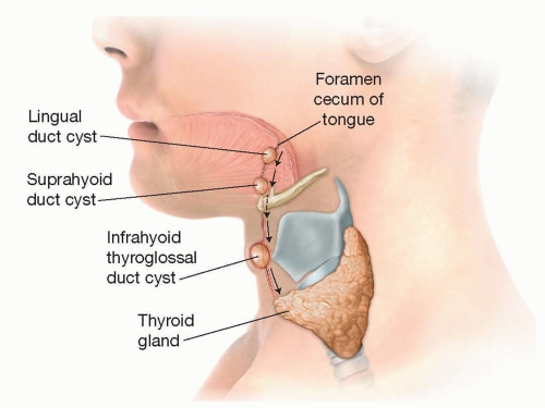 Failure of the tract to obliterate can lead to cyst formation at any point throughout the tract length (FIG 3).