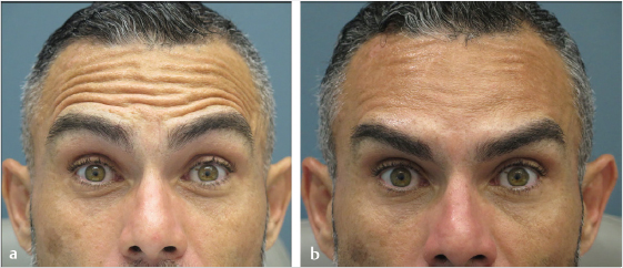 Fig. 2.1 A male patient with deep frontal ridges and wrinkles before and after neuromodulator treatment (45 units total on glabella, lateral orbicularis oculi, and frontalis muscle). (a) Before. (b) After.