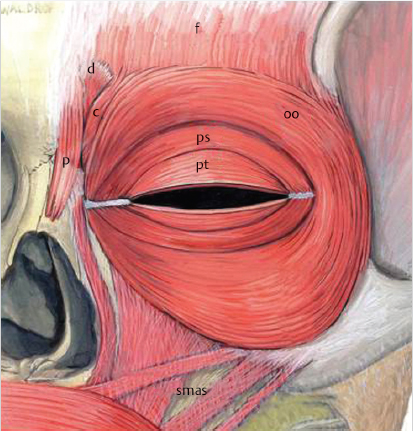 Fig. 2.2 Forehead muscles (c, corrugator; ds, depressor supercilii; f, frontalis; oo, orbicularis oculi; p, procerus; smas, musculoaponeurotic system superficial; ps, preseptal; pt, pretarsal).