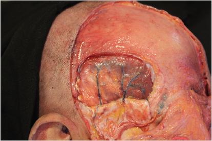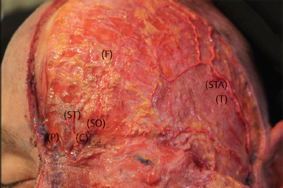 The face and scalp are arranged in six concentric tissue layers that consist of skin, subcutaneous tissue, superficial musculoaponeurotic layer, loose areolar tissue, deep fascia and periosteum, and bone.17 Except for thickness, the skin and subcutaneous layers are basically the same over the entire face and scalp. The musculoaponeurotic fascial layer is attached above to the skin and subcutaneous layers by fine connective tissue bands called retinacula cutis fibers. Over the scalp and forehead, the musculoaponeurotic layer is formed by the galea aponeurotica and its two muscular components, the occipitalis muscle posteriorly and frontalis muscle anteriorly. Here, the skin, subcutaneous layer, and galea form a single functional unit that is mobile over an underlying loose avascular areolar tissue layer.