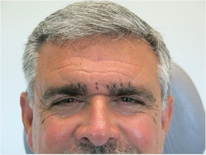 Fig. 2.4 An aging male face with horizontal forehead furrows, and horizontal and vertical glabellar creases.