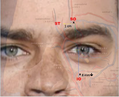 Fig. 2.5 Localization of the main periorbital vascular structures. Note: The best way to locate the main vessels around the eye is to use your patient’s pupil as your guiding compass. For instance, to find the foramen (or cleft where the bundle of supraorbital nerves and vessels emerges), use the iris’ medial limbus and the orbit’s superior margin. The neurovascular structures of the infraorbital foramen are aligned between the iris’ medial limbus and the pupil at approximately 8 mm to 1 cm from the lower orbital rim. Remember that the supratrochlear artery is located approximately 1 cm medial to the supraorbital artery. All these structures emerge from deep within these foramina.