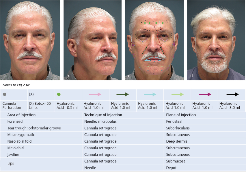In men, supraorbital or frontal bossing is common with an increased concavity at central forehead with aging; consider a combination of neurotoxin and filler injections in selected cases to improve the appearance of deep rhytids without lowering the “heavy” brow complex (Fig. 2.6 and Video 2.2).