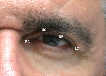 Fig. 2.8 External eyelid and the periorbital region (EP, eyelid platform; LC, lateral canthal angle; MC, medial canthal angle; UC, upper eyelid crease).
