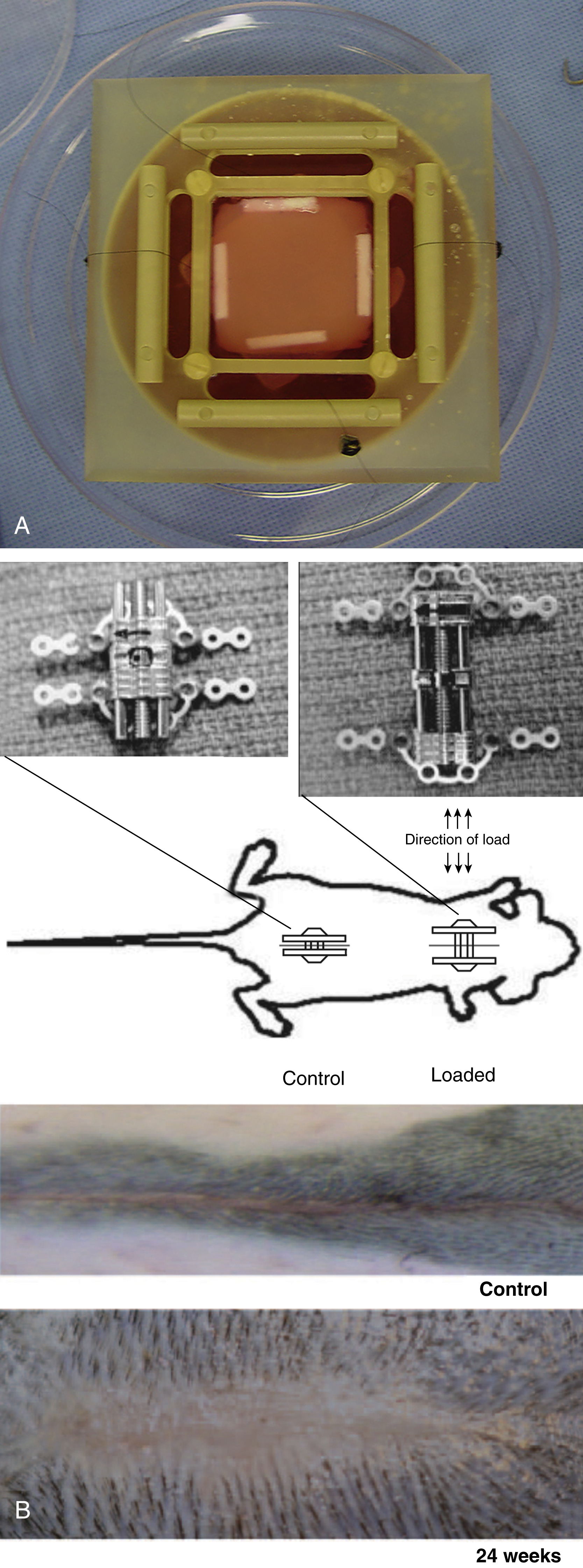 There are many tissue engineering techniques used experimentally to further plastic surgery including, three-dimensional (3D) cell culture/multicellular organotypic culture and tissue- and organ-on-a-chip technology where the local environment of multicellular constructs is tightly controlled. Worldwide, many laboratories use such techniques to examine conditions of relevance to our specialty, such as the effects of diabetes mellitus on wound healing, the survival of ischemic tissues, and Dupuytren’s contracture amongst others. An in vitro model of hypertrophic scarring was developed in our laboratory using tissue engineering principles. A collagen gel seeded with fibroblasts is placed under tension to replicate the conditions for human hypertrophic scar formation ( Fig. 7.2 ). This model has provided invaluable insights into the interaction between cells and their matrix in hypertrophic scarring and facilitated the subsequent development of a murine model. These models provide numerous opportunities for further study as they allow the use of technologies that are not readily used in humans, including gene editing, transgenic organisms, and viral transfection.