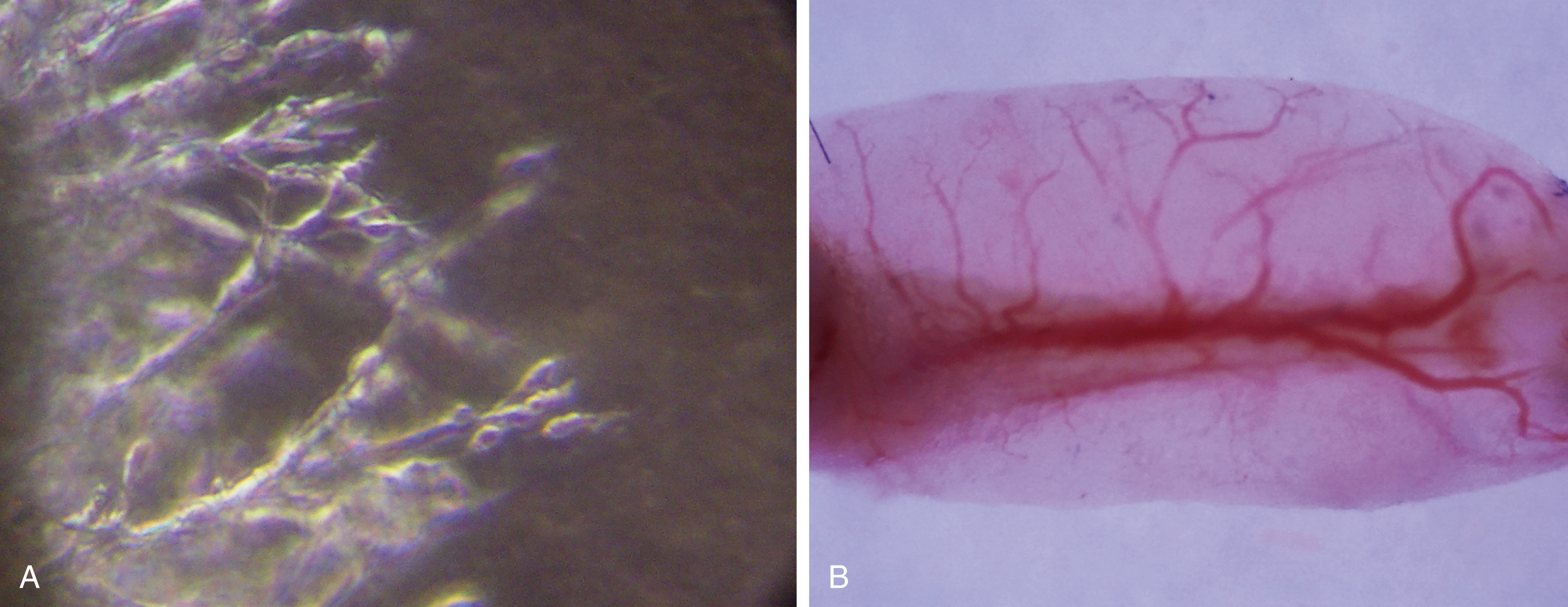 New tissue growth requires new blood vessel formation (neovascularization). Two types of neovascularization have been identified. Vasculogenesis is the de novo formation of blood vessels from vessel progenitors. It is an in utero phenomenon, but it may make a small contribution to neovascularization in the postnatal setting under certain circumstances. Angiogenesis is predominantly a postnatal process where new blood vessels sprout from existing blood vessels under the influence of local factors (growth factors, chemokines, and physicochemical gradients) ( Fig. 7.4 ). Angiogenesis is the predominant process in adult animals for new blood vessel formation and is one of the major targets of cancer therapies and tissue engineering strategies.