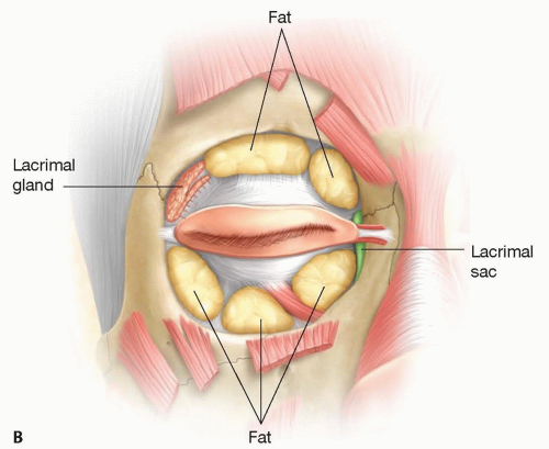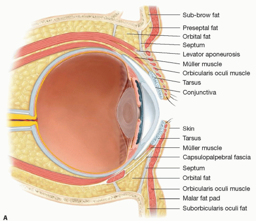 Pertinent anatomic structures are the lower eyelid conjunctiva, Müller muscle, capsulopalpebral fascia, orbital fat, and orbital septum (FIG 1).
