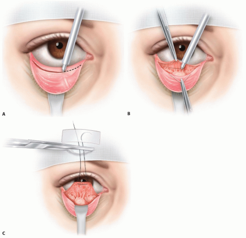 A Colorado needle is used to cut the conjunctiva from the medial to temporal end of the eyelid halfway between the inferior palpebral fornix and the inferior tarsal border (TECH FIG 1A).