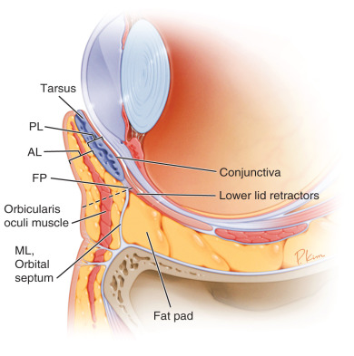 Sagittal section of the lower eyelid demonstrating the AL (skin/muscle) and PL above (tarsus/conjunctiva) and below (lower lid retractors/conjunctiva) the tarsus. The FP of the lower lid retractors and orbital septum, the ML (orbital septum), and fat pads are also shown. The FP is critical for incision placement during surgery. AL , Anterior lamella; FP , fusion point; ML , middle lamella; PL , posterior lamella.