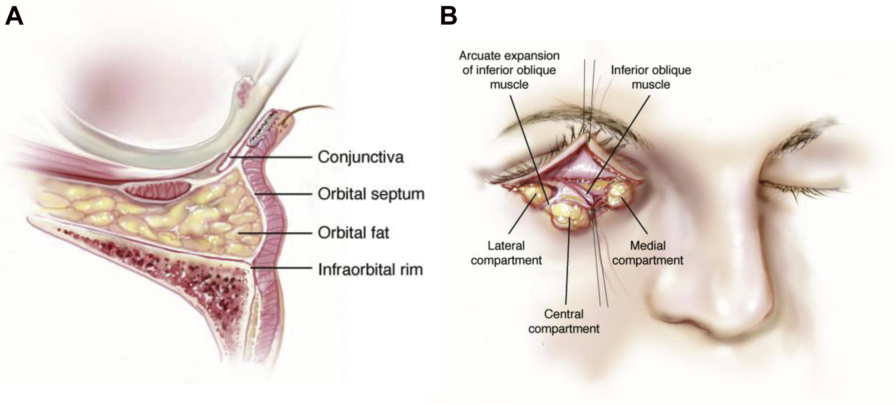 The transconjunctival approach allows the surgeon to address herniated orbital fat as well as midface volume loss. In manipulating the inferior orbital fat pads, a surgeon has options, including excision alone, augmentation with autologous fat grafts, or fad pad transposition.