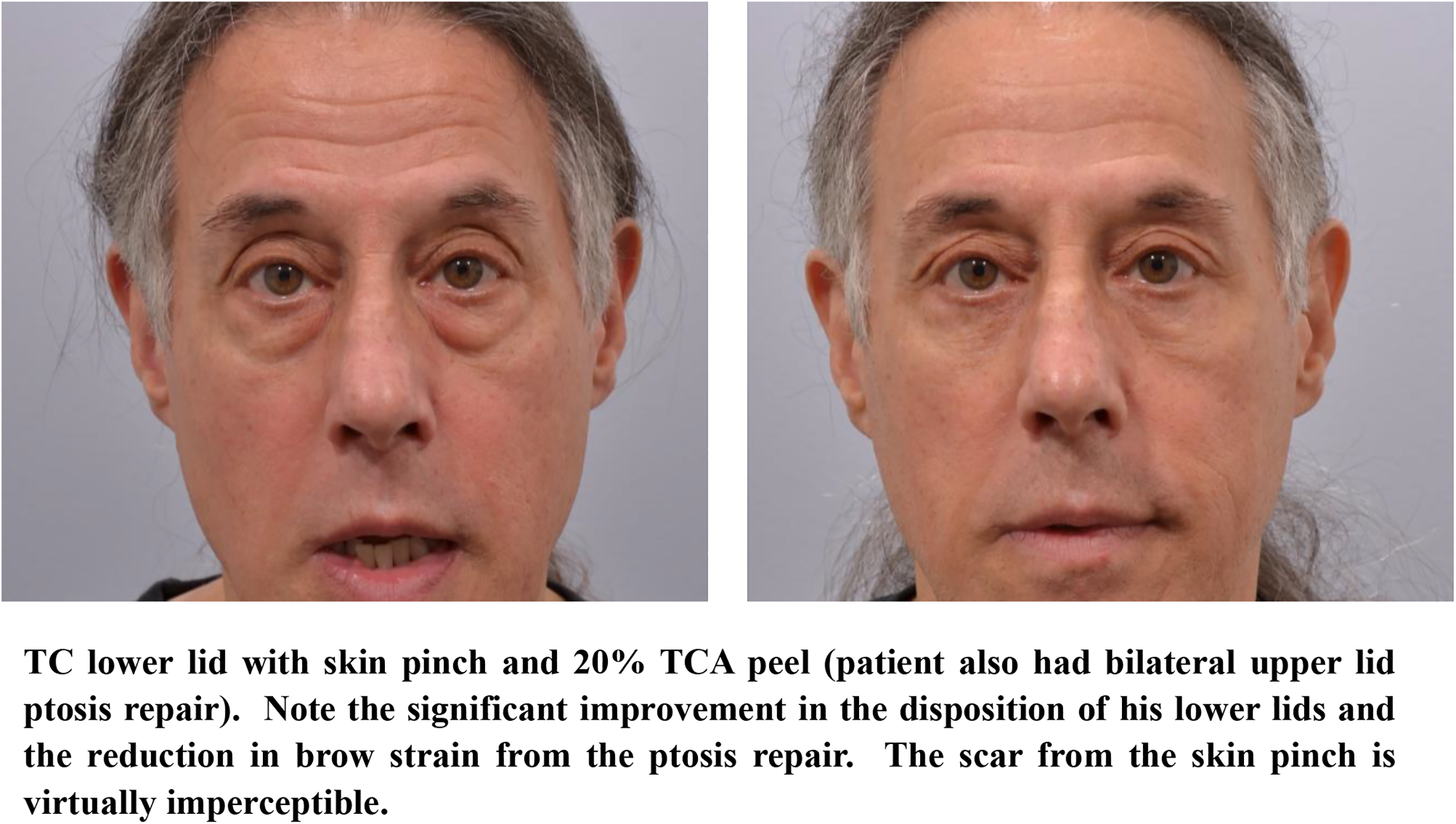 The lower lid skin can be resurfaced with a peel, with a laser, or by skin pinch depending on surgeon preference.