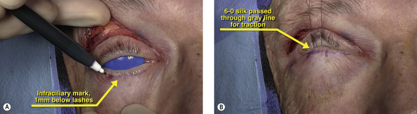 Transcutaneous access to the lower eyelid is performed through an infraciliary incision within 1 mm of the eyelashes ( Figure 10.2A ). The incision should be marked before the infiltration of local anesthetic to minimize distortion. The marking should initially extend from the punctum to the lateral canthal angle. Local anesthetic containing 1 : 200,000 epinephrine is given both through the conjunctival approach as well as along the transcutaneous marking to minimize orbicularis bleeding. When injecting transcutaneously, the needle is injected in a pre-orbicularis plane and used to hydrodissect the skin from the underlying muscle. A 6-0 silk suture is then passed through the gray line and placed on superior traction ( Figure 10.2B ). Prior to the start of surgery, a corneal shield is put in place.