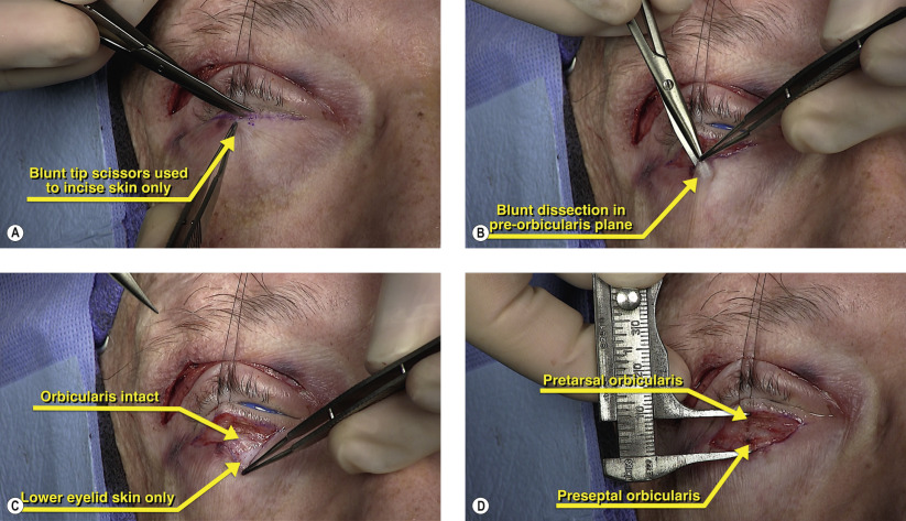 With superior traction on the eyelid, the infraciliary incision is made with blunt tip Westcott scissors ( Figure 10.3A ). The incision should be kept very close to the eyelashes to maximally conceal the scar. When making this incision, the inferior edge of the skin is tented up with 0.5 forceps to dissect the skin away from the underlying orbicularis. With adequate delivery of the local anesthetic in the pre-orbicularis plane, the skin should easily dissect free from the muscle. Minimizing trauma to the pretarsal orbicularis will lessen the chance of developing postoperative ectropion from an atonic muscle. Using the Westcott scissors, dissection is continued inferiorly with the blunt tips of the scissors directed towards the skin in the pre-orbicularis plane ( Figure 10.3B ). Care is also taken when handling the thinned lower eyelid skin as this is reflected inferiorly ( Figure 10.3C ). The dissection is continued inferiorly for at least 4 mm below the eyelid margin to expose the preseptal orbicularis ( Figure 10.3D ).