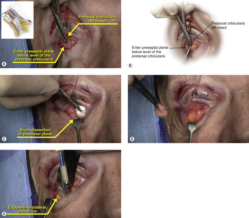 Once the dissection in the pre-orbicularis plane is complete, the anterior orbit is entered. Sharp dissection is performed at the level of the preseptal orbicularis at a level below the pretarsal orbicularis ( Figures 10.4A and 10.4B ). This preseptal orbicularis window is extended medially and laterally with sharp dissection. Once the preseptal plane has been exposed, blunt dissection with a peanut sponge or cotton-tip applicator is performed with inferior countertraction using a Senn retractor ( Figure 10.4C ). Further blunt dissection in this avascular plane exposes all three lower eyelid fat pads and is continued to the inferior orbital rim ( Figures 10.4D and 10.4E ). Any fine bleeders are coagulated with bipolar cautery.
