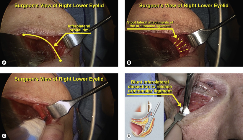 The orbitomalar ligament is the primary retaining ligament of the midface which anchors the suborbicularis oculi fat (SOOF) to the lateral orbital rim. Release of the orbitomalar ligament and superior suspension of the SOOF provides aesthetic elevation of the midface and protection against lower eyelid retraction. The orbitomalar ligament has broad midfacial attachments and the stoutest attachments are to the inferolateral orbital rim, as shown in Figures 10.5A and 10.5B . A malleable retractor is placed along the inferolateral orbital rim with a Senn retractor providing countertraction. Cutting cautery is used in the dissection along the inferolateral orbital rim to lyse attachments of the orbitomalar ligament ( Figure 10.5C ). Once the orbitomalar ligament has been released, a peanut sponge is used to bluntly dissect any residual attachments to the lateral orbital rim ( Figure 10.5D ). Care is taken during the inferolateral dissection along the orbital rim as the zygomaticofacial artery and nerve exit via its foramen. If bleeding occurs from this foramen, gentle bipolar cautery should be applied to prevent significant midfacial hemorrhage. Neurosensory loss is minimal and recovery is rapid and uneventful.