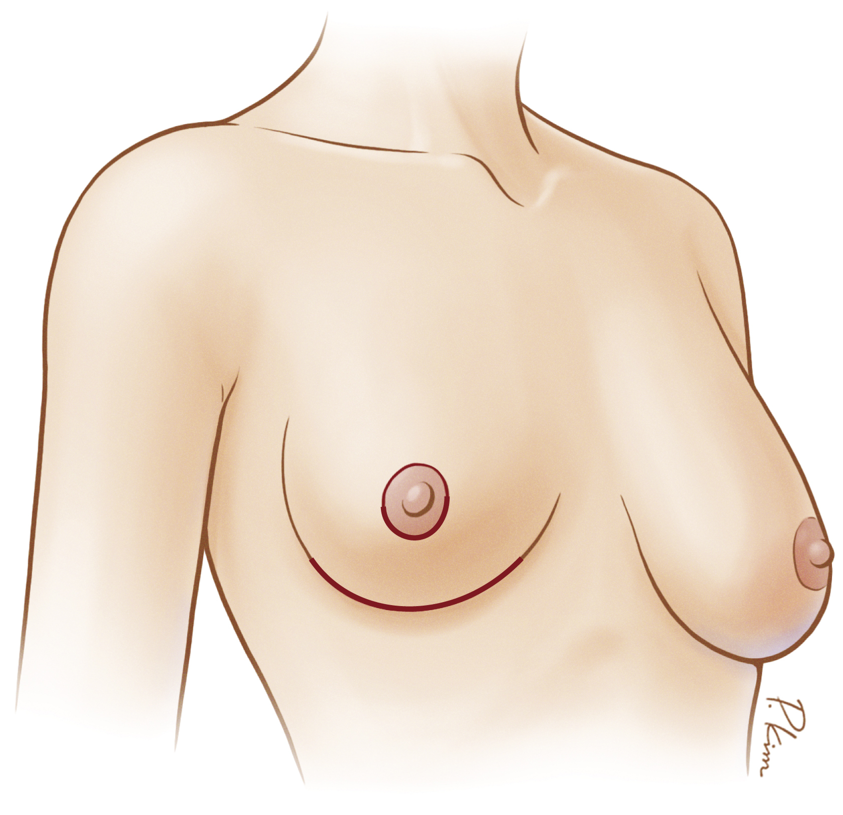 Because of the larger sized implants that most of these patients desire, if an IMF incision is placed directly within the IMF, the problem of postoperative scar migration onto the breast might result. Therefore, we generally place our IMF incision at least 1 cm inferior to the native IMF, depending on the size of the implant being placed.