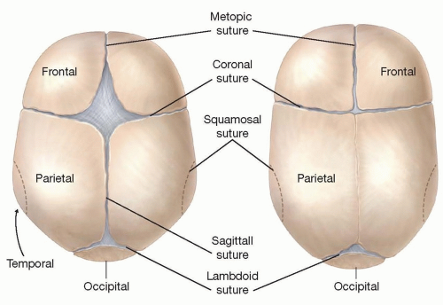 • The major cranial sutures are metopic, sagittal, coronal, lambdoid, and squamosal.