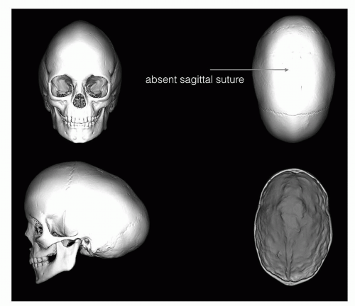 • Computed tomography scanning of the head with 3D reconstruction (FIG 2) shows the classic findings in premature fusion of the sagittal suture: