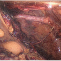 Leave both adrenal glands attached to the kidneys until after graft reperfusion when they are excised (FIG 1). Ligate and divide the left and right adrenal vein in close proximity to each adrenal gland. Carefully ligate and divide the tissues connecting the inferomedial aspect of each adrenal gland to the hilar structures. The adrenal glands can now advantageously be used as handles to avoid grasping the kidneys themselves. Tie each end of a long 4-0 silk to the adrenal glands’ upper pole, creating effectively a bucket handle-like structure that can be used for atraumatic lifting of the kidneys as they are being placed on pump, for manipulation while on pump, and at the time of the implantation.