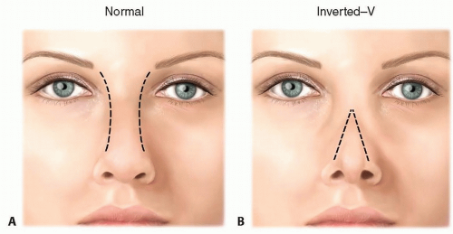 Evaluate symmetry of the upper lateral cartilages. An inverted-V deformity may be present as a result of collapse of the upper lateral cartilages.