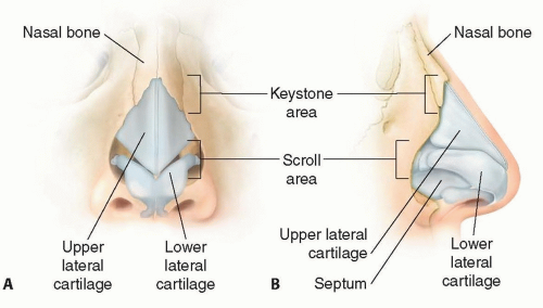The middle vault is composed of the paired upper lateral cartilages, overlying soft tissue and skin, and underlying attached mucosa. Superiorly, the keystone area (also referred to as the K area) is the junction of the upper lateral cartilages with the nasal bones. Inferiorly in the scroll area, the upper and lower lateral cartilages are connected by loose areolar and fibrous attachments (FIG 2).