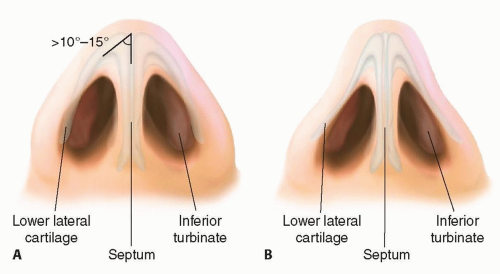 The internal nasal valve is defined by the caudal border of the upper lateral cartilage, the septum, the head of the inferior turbinate, and the piriform aperture. Nasal airway resistance accounts for more than 50% of total airway resistance during nasal breathing, and the internal nasal valve has the smallest cross-sectional area of the nasal airway. The normal angle between the septum and upper lateral cartilage is 10 to 15 degrees (FIG 3A). An angle below this range can contribute to nasal obstruction (FIG 3B).3