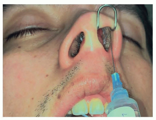 Local anesthetic consisting of 1% lidocaine with 1:100 000 epinephrine is infiltrated into the nasal sidewalls and columella and inside the nostril along the lower lateral cartilages (FIG 4).