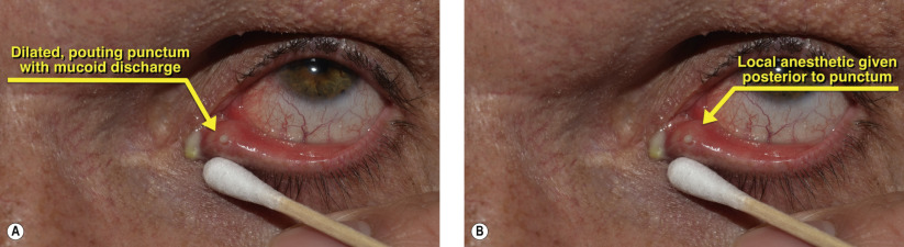 Canaliculitis is an infection of the canaliculus and the proximal lacrimal ducts. It classically presents with epiphora, medial eyelid swelling, conjunctivitis, and a characteristically elevated pouted punctum with mucopurulent discharge ( Figure 61.1A ). Canaliculitis is often confused with chalazia but is distinguished by its centration about the punctum where the meibomian glands are not present.
