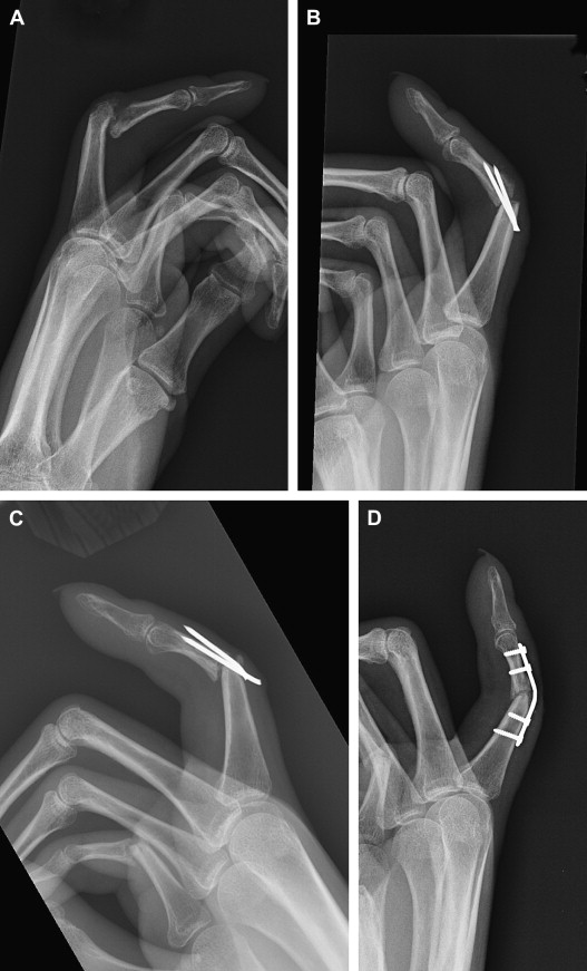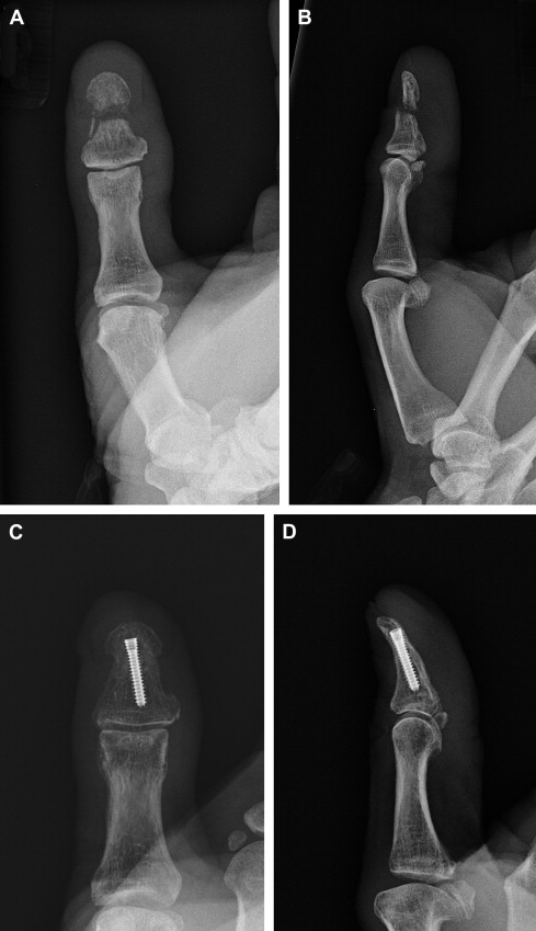 When the nonunion is in the shaft of the distal phalanx, this can often be treated with compression across the nonunion site, either through an open approach or with percutaneous compression screw placement ( Fig. 2 ).