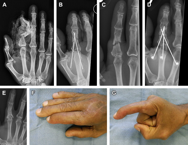 Amputation should be considered for cases with sensory loss, stiffness, persistent infection, or poor soft-tissue coverage. A stiff digit is often a liability to hand function and, even if the nonunion were to heal, the digit remains stiff and can impair hand function ( Fig. 4 ). Recovery following amputation is often rapid, and leads to improvement in function of the hand.