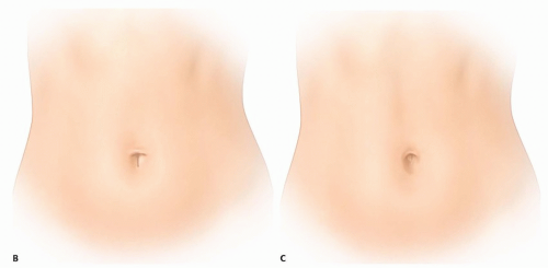 The aesthetic ideal of the female umbilicus has been described as T or vertical in shape with a superior hood or shelf.1 Protrusion, transverse orientation, or excessive size are rated as less attractive. There is a linear depression running from the xiphoid to the umbilicus, and this compares to the smooth contour of skin without a depression from the umbilicus to the symphysis pubis. Surrounding the umbilicus is a zone of decreased fat approximately 3 cm in diameter total, and this fat thickens to its maximum dimension for the ventral abdomen over the anterior rectus fascia.