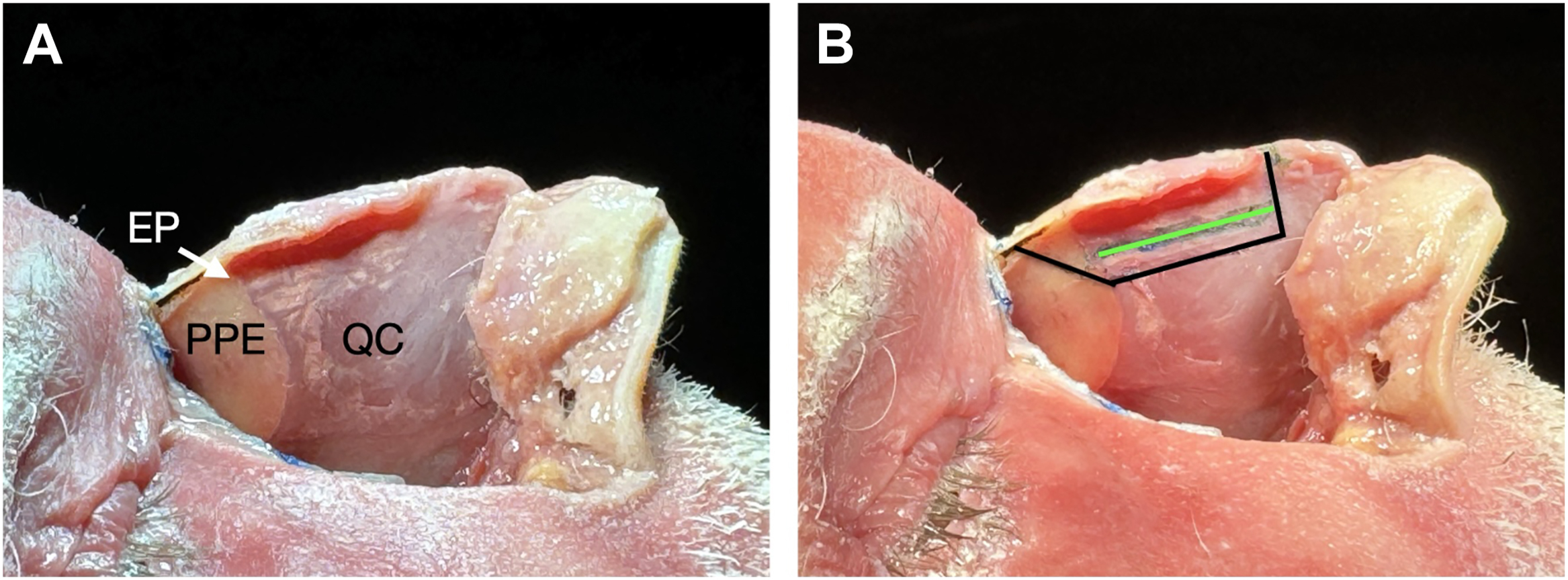 ( A ) Cadaveric specimen showing a dorsal hump. Note: The quadrangular cartilage (QC) extends underneath the nasal bony cap and contributes to the external contour. Ethmoid point (EP) is location where the QC meets the perpendicular plate of the ethmoid (PPE) under the nasal bones. ( B ) Markings of incisions for the modified subdorsal strip method (MSSM) approach to the cartilaginous and bony septum. Green line delineates the dorsal incision. Black line indicates the lower incision and the intervening strip of septal cartilage is removed. The lower incision ( black line ) extends into the PPE to connect to the transverse osteotomy on the nasal bones.