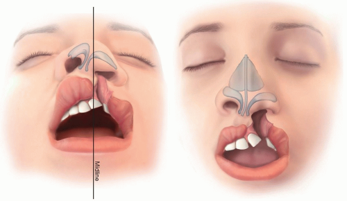 Maxilla—The underlying skeleton forms the platform upon which the soft tissues rest. Thus, the skeletal abnormalities of the maxilla can explain many of the soft tissue abnormalities seen, particularly in the nose. The greater segment of the alveolus is anteriorly rotated due to the fetal protrusion of the tongue. The lesser segment of the alveolus rotates posteriorly. The medial buttress of the maxilla can be hypoplastic and posteriorly displaced.
