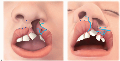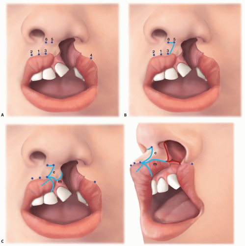 The height of the lip from the alar base to the height of the Cupid’s bow on the noncleft side is measured with a caliper, and the vertical distance is used to locate the corresponding white roll point on the lateral lip element (point 4). Some surgeons use the widest point of the vermilion (Nordhoff point) to determine point 4. However, in patients with a wide cleft, Nordhoff point will commonly result in a vertically foreshortened lip. Using the vertical height of the contralateral upper lip can sacrifice horizontal lip length for preservation of vertical lip height. The horizontal lip discrepancy will correct over time; however, a vertically shortened upper lip will remain.