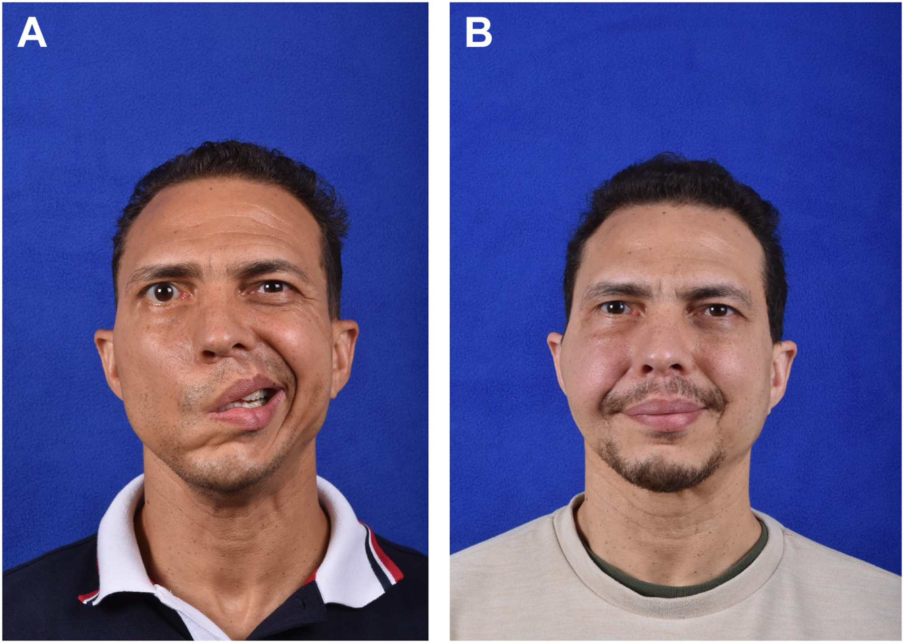 The primary disadvantage in using the masseteric nerve to drive a GFMT-powered smile is the lack of consistent spontaneity of movement. Smiling activated by the masseteric nerve primarily requires a voluntary biting or clenching action. Therefore, when an emotive smile is involuntarily elicited on the unaffected side, a natural-appearing smile on the GFMT side to match synchronously can be challenging and requires training and effort. While several studies have explored spontaneity with extensive facial physical therapy and motor training, the majority of patients has reported spontaneity only a small percentage of the time. ,
